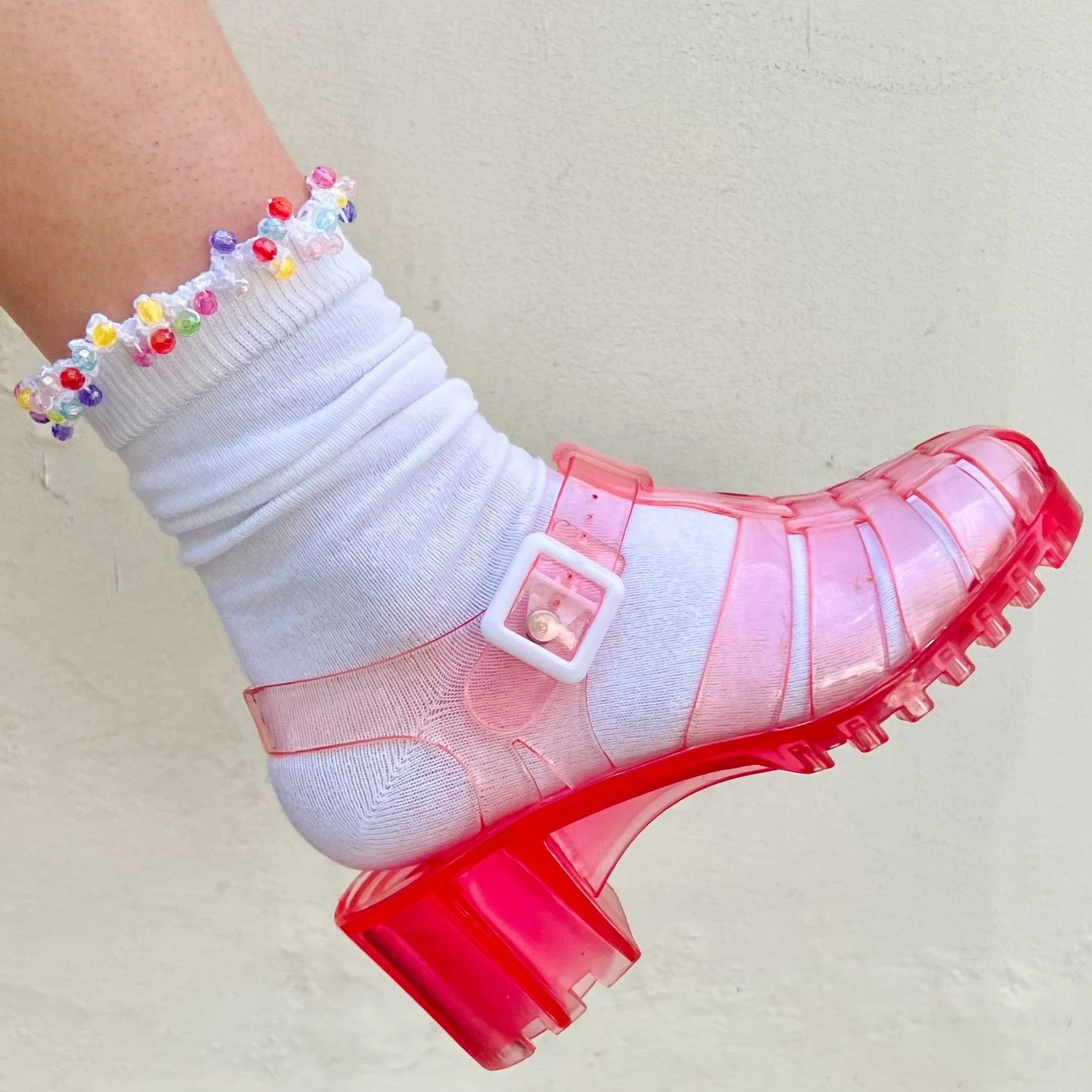 all you’ll need for this quick project are a pair of socks, a 1.5-2.5mm crochet hook, crochet thread, and about 130 beads.