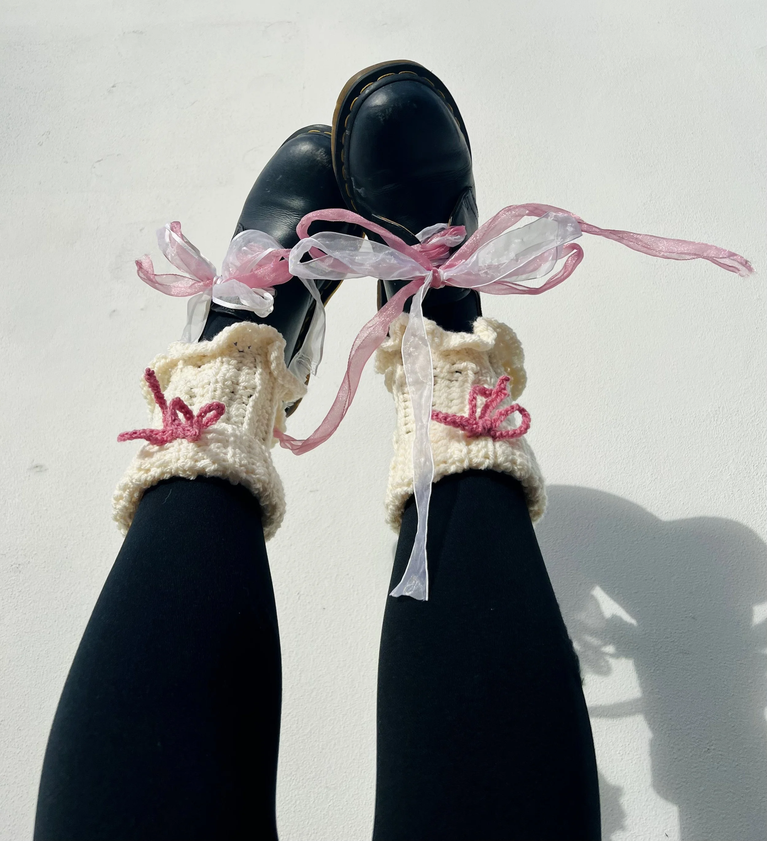 tie chain into a bow and stitch onto the flap of the legwarmer
