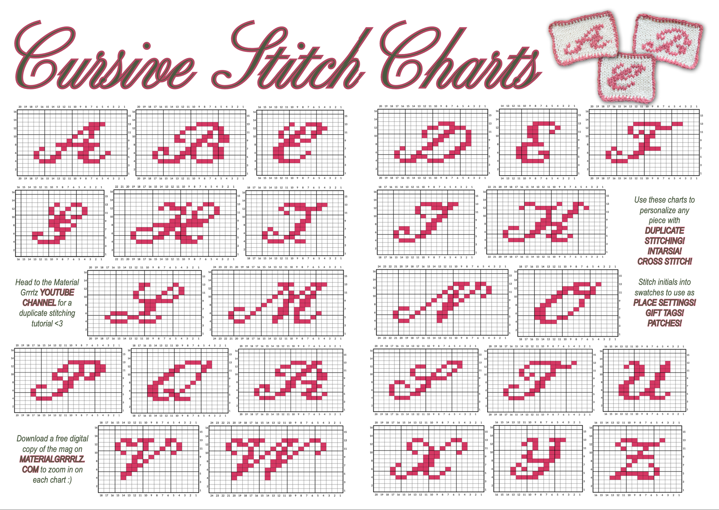 A complete video tutorial on duplicate stitching and following the alphabet charts is available on the Material Grrrlz YouTube channel: