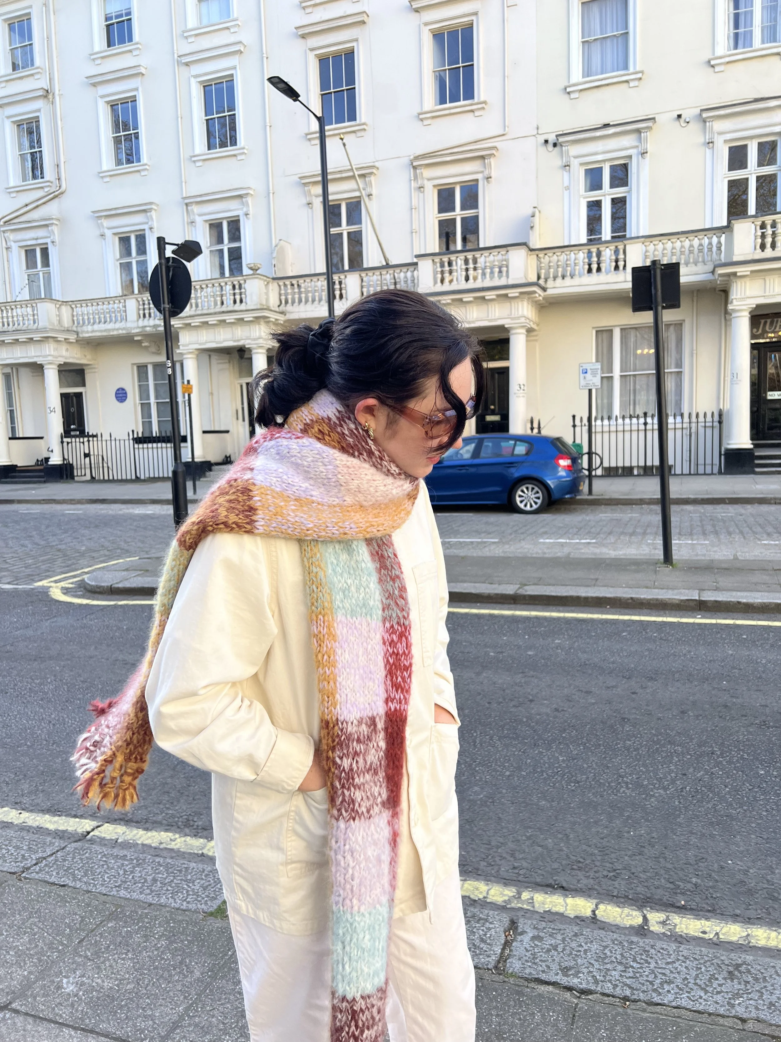 the it girl scarf is knit in stockinette stitch, holding two strands of contrasting color yarn throughout to create a unique texture and checked color gradient. fringe is added on either end. this is a great project to use up scraps! the pattern calls for 6 different colors of yarn, but you can switch between more of them if you want to use up your stash and make a technicolor masterpiece:)