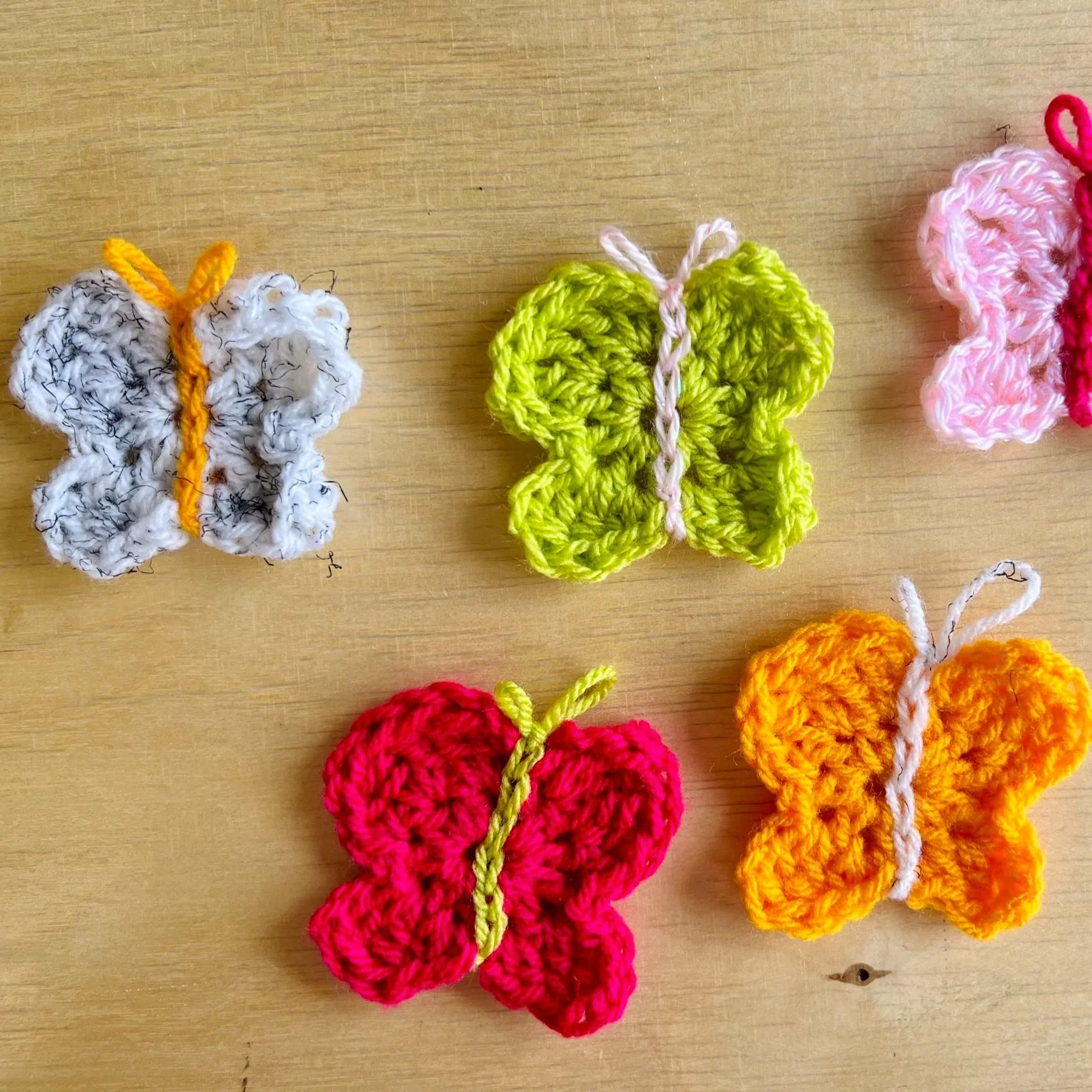 Tie off. Using a different color, surface crochet through the center of the butterfly so there is one big and one small wing on each side. Cut yarn, but instead of tying off normally, tie the end into a bow to look like antennae.