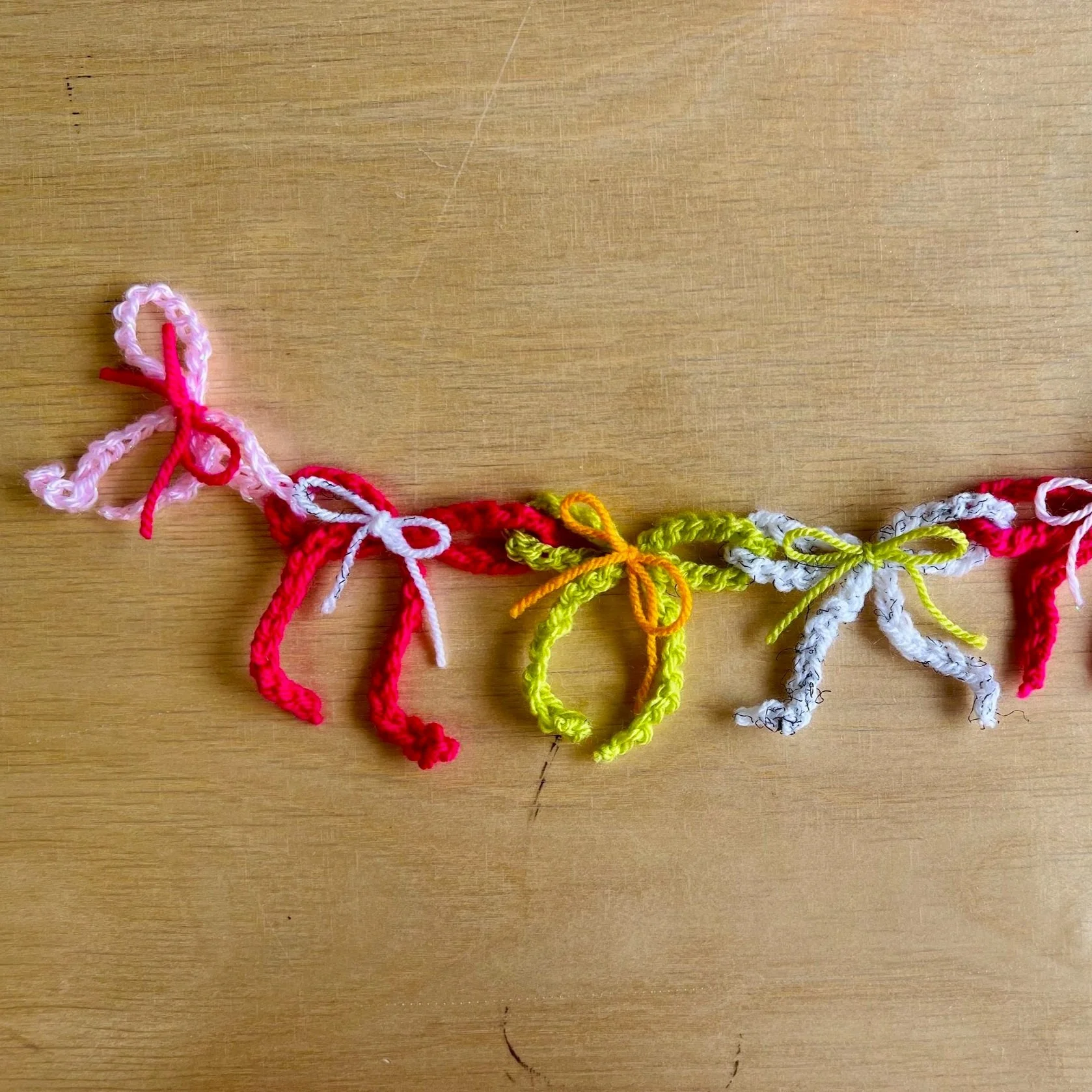 To connect bows together through their loops, lay one chain in a bow shape (without tying anything) and tie a double knot around it using an 8 inch piece of yarn. Tie the yarn in a bow to create a double bow effect.
