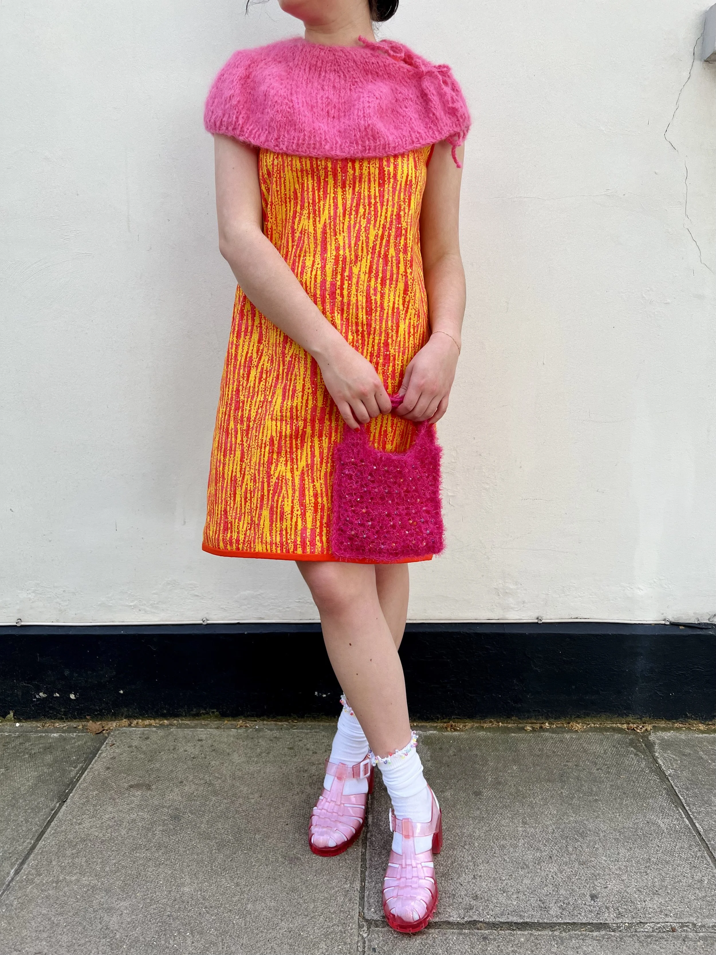 you will create two beaded squares, then seam them together and add straps. throughout the pattern, you will be switching between hooks to attach beads. to insert a bead, put your small hook into the bead, pull working yarn through the hole, yarn over, and pull through the loop to secure bead. switch back to 6.5mm needle for stitches between beads.