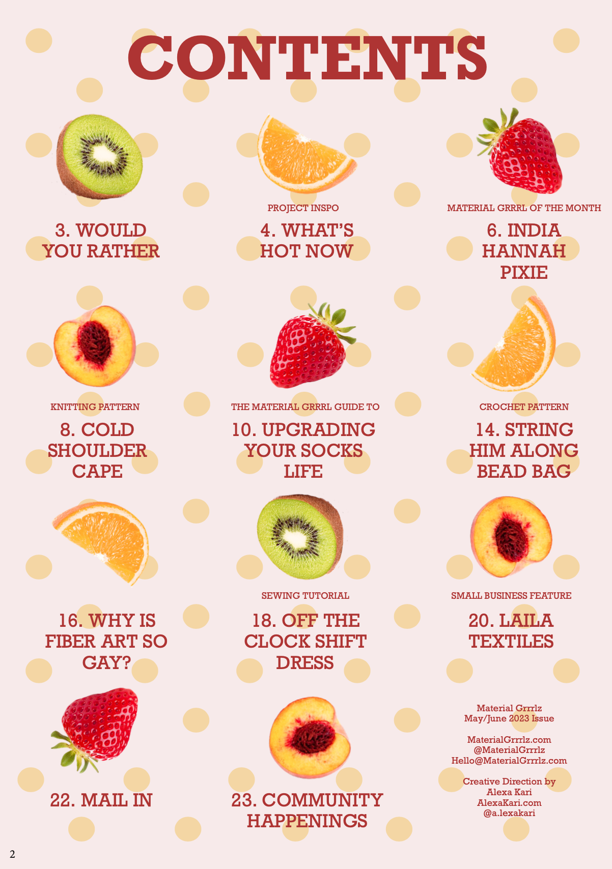 Happy spring, material grrrlz! In issue 3, we’re talking about why fiber art is so gay and how to create the best socks you’ve ever had. AND we’re entering the world of sewing patterns! Self draft your own shift dress, crochet a beaded purse, and knit a cute little cape - all patterns are inside:)